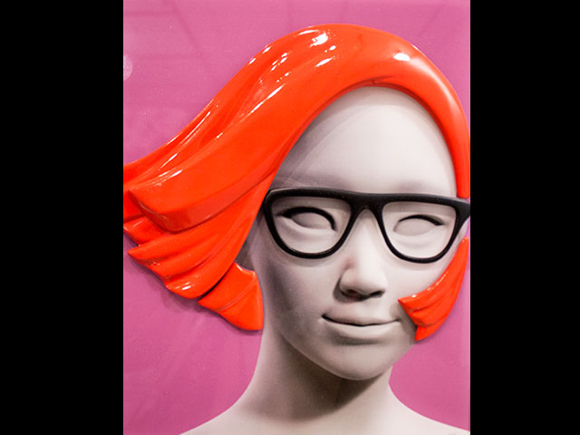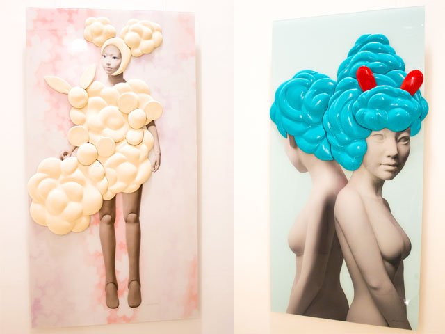 Kim Min-Kyung’s “Camouflage Selves” uses synthetic resins and plastics with prints encased in acrylic. Despite the bright colors, it has an underlying dark statement.